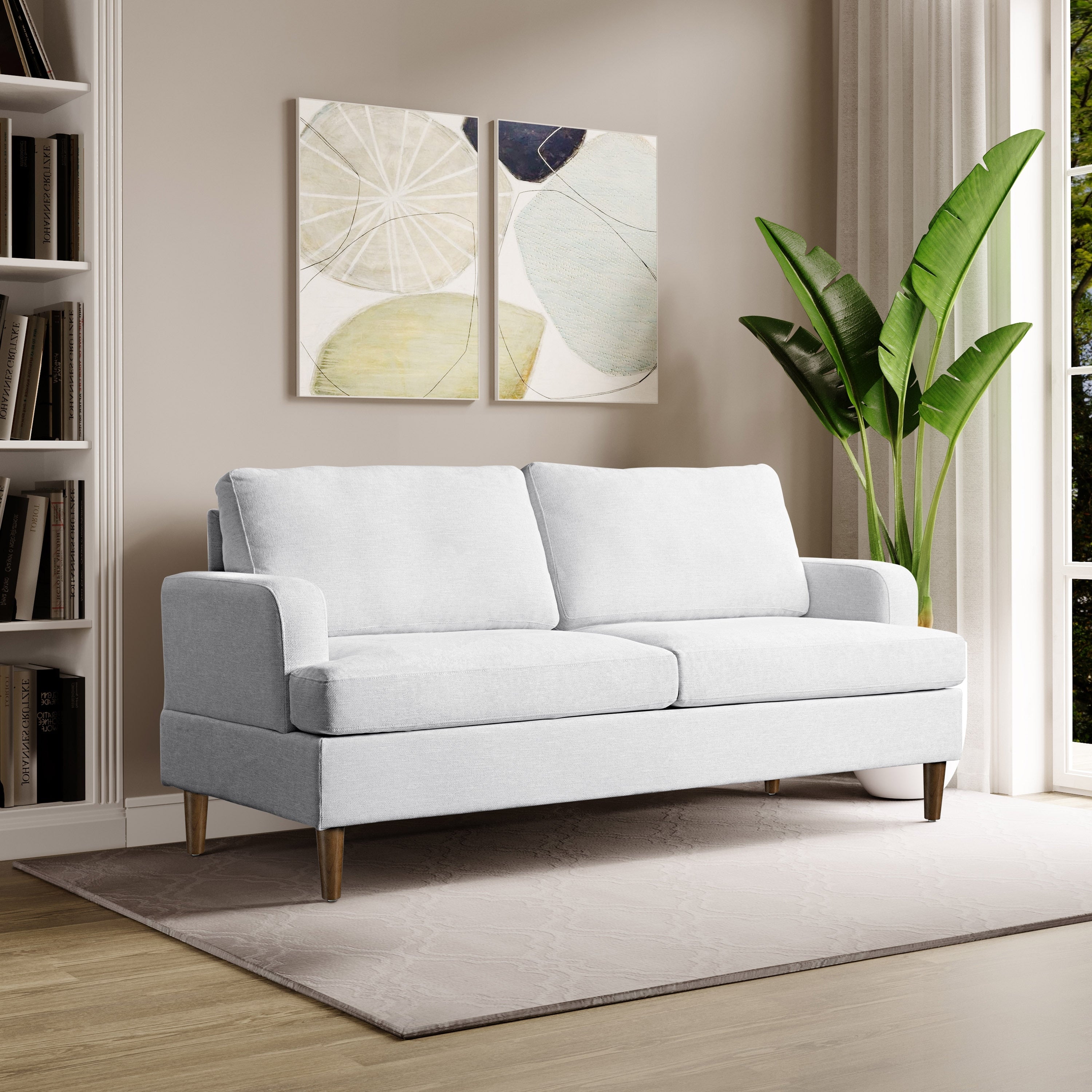 The Serta Francis Sofa Set joins a minimalist aesthetic with maximized comfort. The compressed seat and back cushions are packed with high density foam and pocket coils, while the neutrally-toned woven fabric upholstery is comfortable and easy to clean. The solid hardwood frame and medium-tone wooden legs provide a durable base for this lovely set.Available in sofa, loveseat an arm chairTapered solid wood leg in a natural finishRecessed track armPocket coils and high density foamAssembly Required