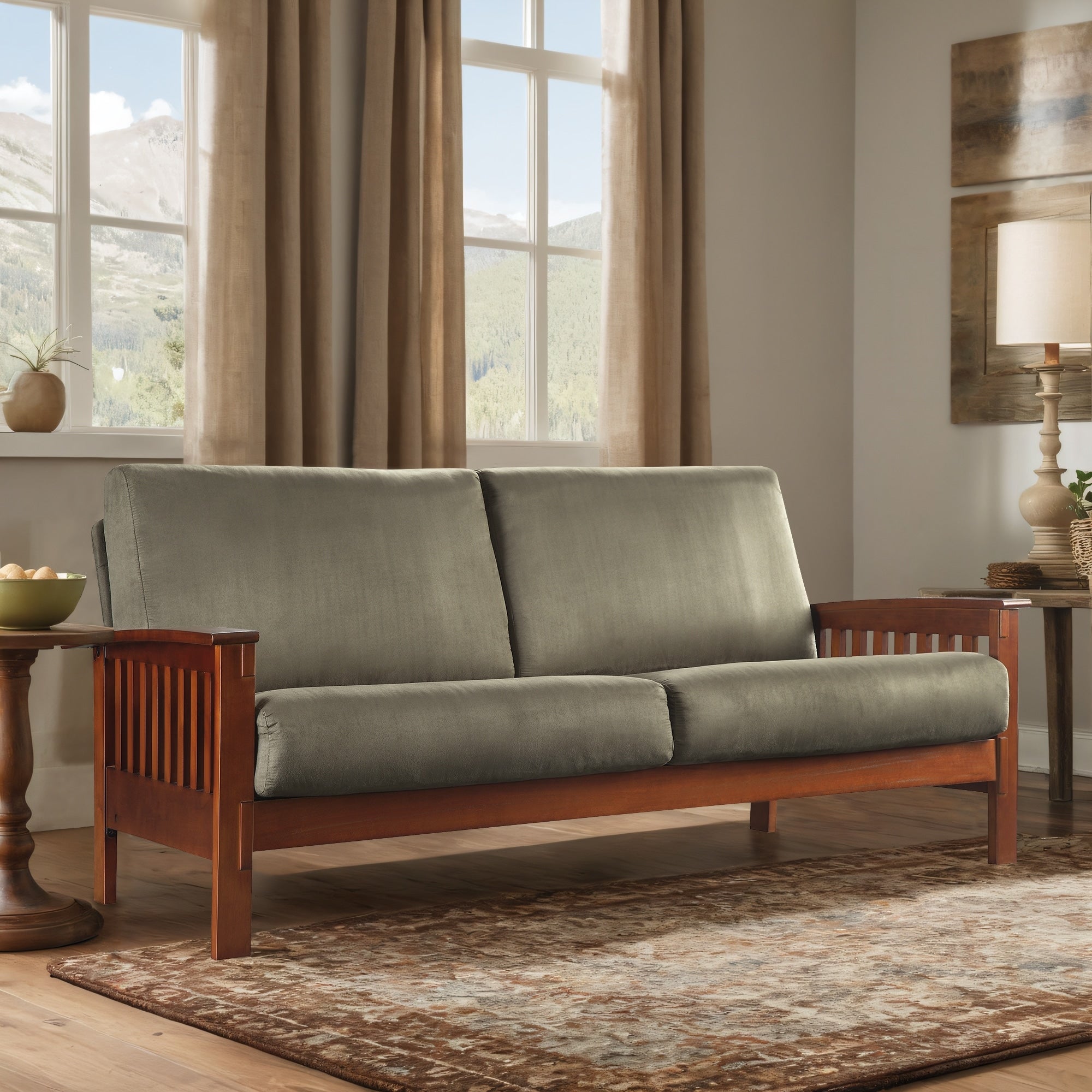 Add cozy and stylish seating to your living room with this Mission-Style Wood Sofa. Taking cues from mid-century modern aesthetics, this state-of-the-art sofa boasts a mission-style design with a reliable rubberwood frame, rich wood finish, and steam-bent arms. This stunning sofa comes in a neutral color palette, so it is sure to match with your unique style.